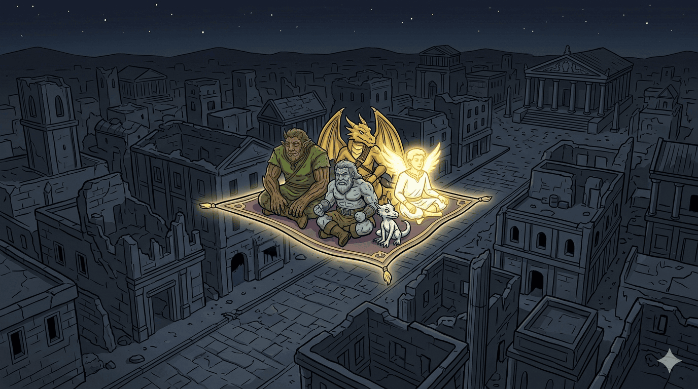 The party on a flying carpet descending toward an ancient ruined city at night — human-sized stone buildings crumbling in the dark, paved roads visible, a larger civic building at the center, temple ruins, an ancient graveyard. Alien star field above, no moon, stars slowly wheeling. The carpet a small warm shape against the cold scale of the ruins below. Perspective: from the carpet looking down and forward at the city. Color palette: deep night blues, gray stone ruins, faint starlight, the carpet’s warm woven pattern.
