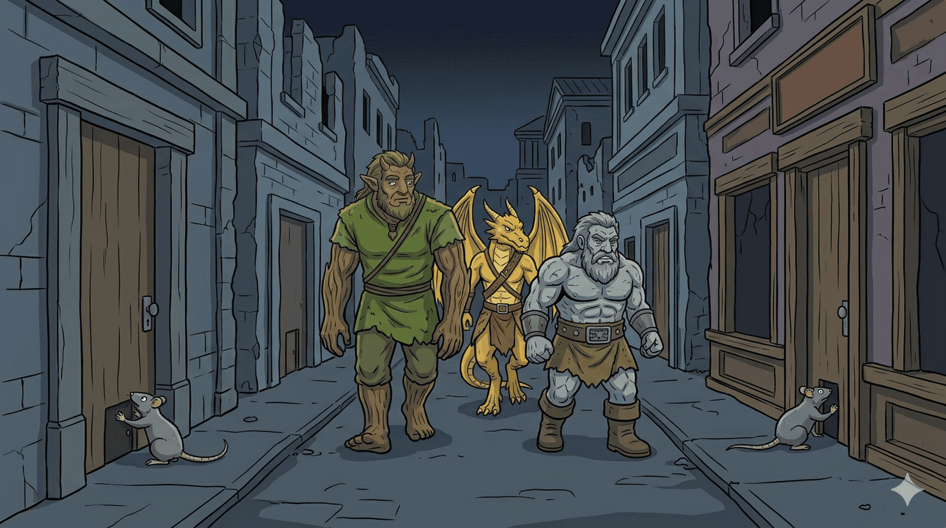 Street-level view in the ruined city — ancient crumbling stone buildings lining a dusty road. Every doorway has a small intentional rat-door built into it, dusty with age. Party exploring the street: Tovin crouching to peer at a rat door at knee level, Kiet standing examining one with X-ray ring glowing on his hand, tiny kobold Haru walking directly through a rat door with complete dignity. Rat companion “12” running ahead excitedly, nose twitching. Sundr illuminating the scene with soft golden light. The rat doors perfectly sized for something small. Street-level layered composition: foreground cobblestones, midground party, background ruined buildings receding.