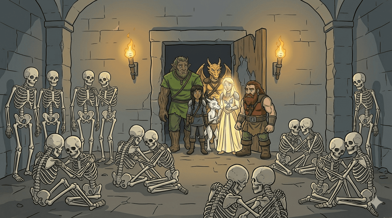 Dark basement room revealed as Gemnar smashes open a stone door — the party flooding in, backlit by Sundr’s golden aura. Inside: dozens of ancient human skeletons frozen in their final moments. Not a chaotic pile — arranged exactly as they died. Pairs standing together, groups huddled on the floor with arms around each other, some clutching possessions. They knew the end was coming and chose to face it together. One skeleton near the front clutches a platinum dragon talisman in an outstretched hand. The bones ancient and intact, clothing long decayed.