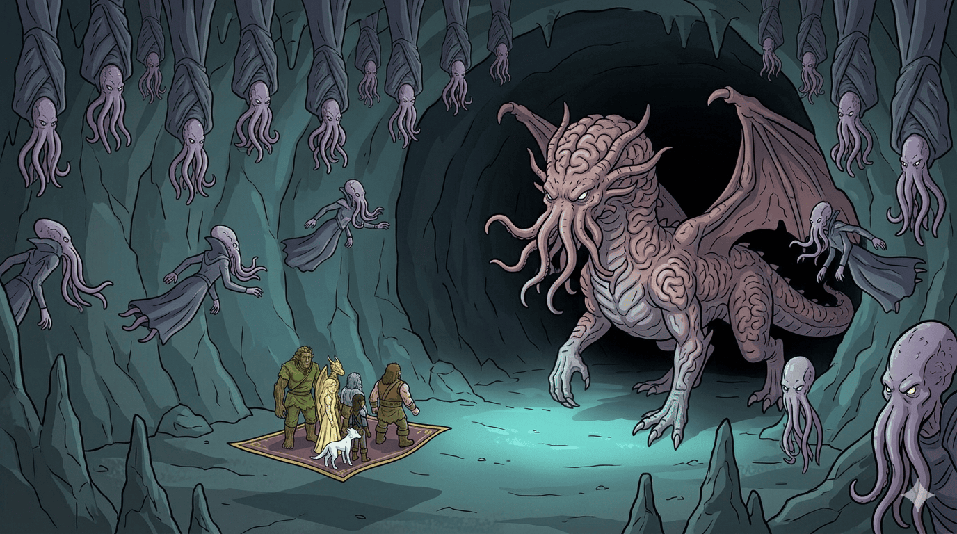 Bottom of the pit cavern, massive stalactites overhead. The party on their carpet, tiny, in the foreground. Stepping from the darkness into bioluminescent light: an Elder Brain Dragon — gargantuan, dragon body with a mind flayer head and writhing tentacles, skin the color of preserved brain matter, eyes glowing deep violet. Dozens of mind flayers floating around it like an honor guard. Psychic pressure visible as rippling purple distortion waves in the air. Rat companion “12” staring up from Tovin’s shoulder, eyes wide and overwhelmed. Low-angle hero composition: the dragon filling most of the frame, party tiny at the bottom.
