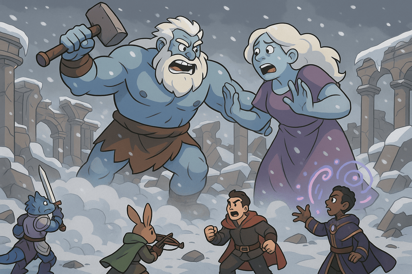 Cartoon-style fantasy scene, wide aspect ratio. In a snow-covered temple courtyard, two towering cloud giants grapple among fallen columns — Rotan, the male, red-faced and furious, wields a stone hammer, while Himmyglava, the female, pleads with him mid-struggle. Below them, the party looks tiny: Kiet (dragonborn) braced with sword raised, Boris aiming a crossbow through swirling fog, Virgil cracking his knuckles, and Sundr’s hypnotic magic glimmering in the air. Snow whirls, chunks of masonry tumble — a comically epic scale difference.