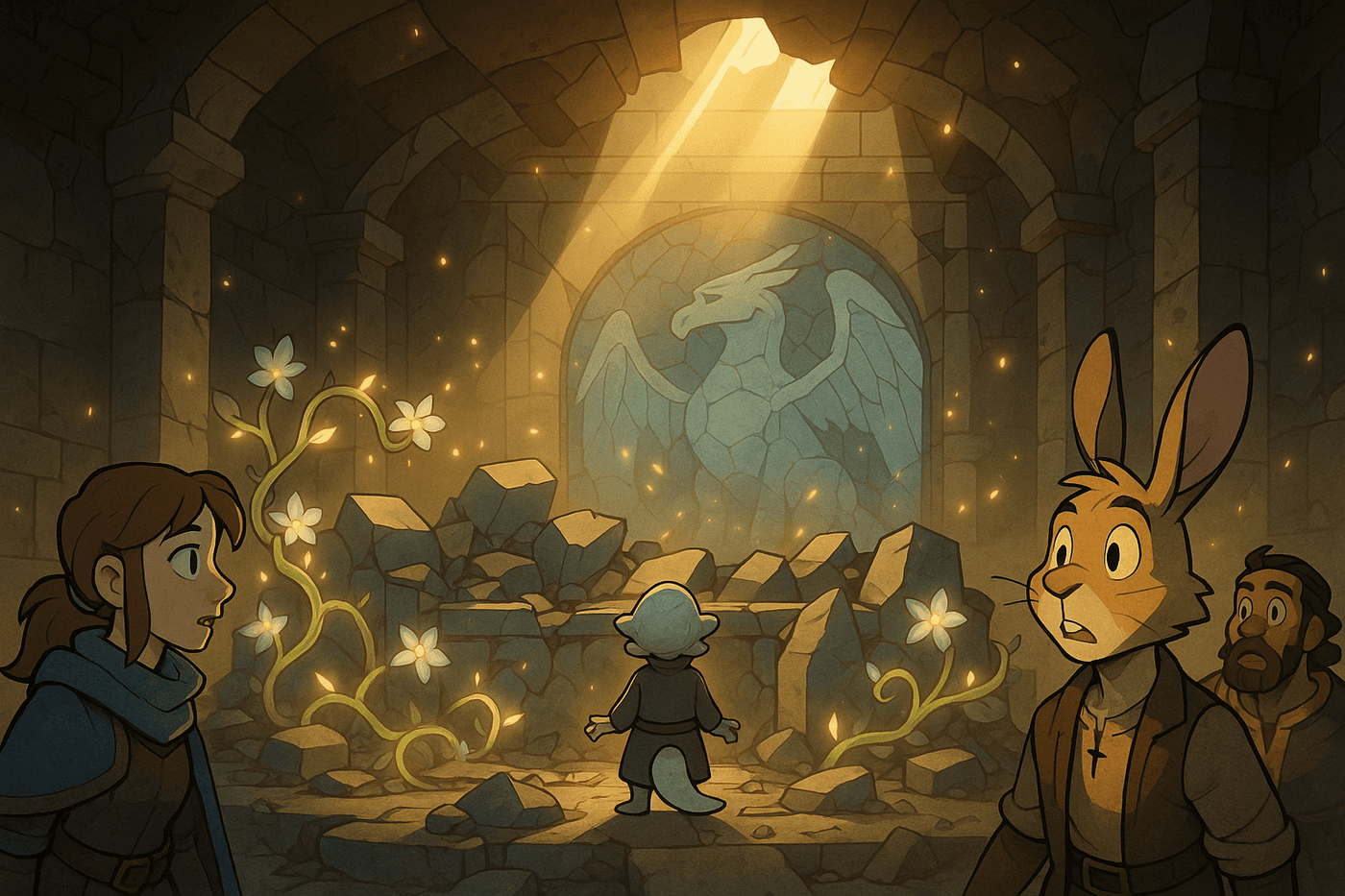 Cartoon-style mystical scene, wide aspect ratio. Inside the ruined temple, Haru the platinum kobold stands before a shattered altar, light streaming through cracks in the ceiling. Glowing vines and silver-petaled flowers twine through the broken stones. In the reflection of a cracked mosaic, a faint image of Bahamut appears — platinum wings folded, watching silently. The party gazes in awe as divine motes fill the air.