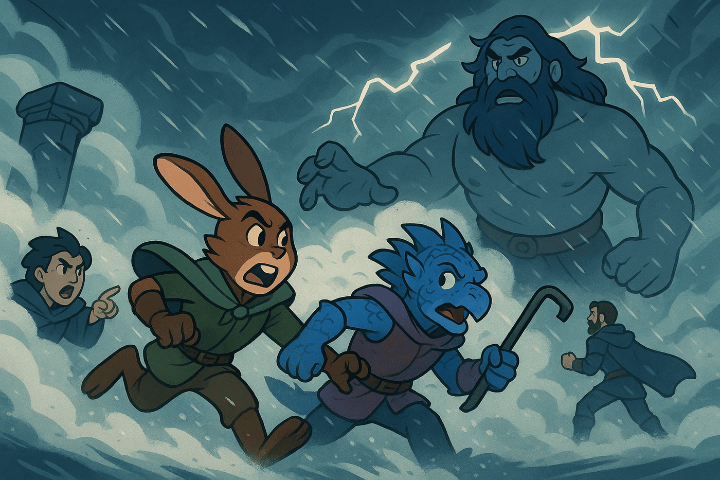 Cartoon-style fantasy action, wide aspect ratio. Boris the harengon bursts from a bank of magical fog, dragging Kiet out from under the giant’s grasp with a crowbar, both mid-sprint as lightning flashes above. Haru shouts orders from behind a broken pillar, while Virgil squares up to the towering Rotan in the background. Dynamic motion lines, fog and snow swirling, chaotic but heroic energy.