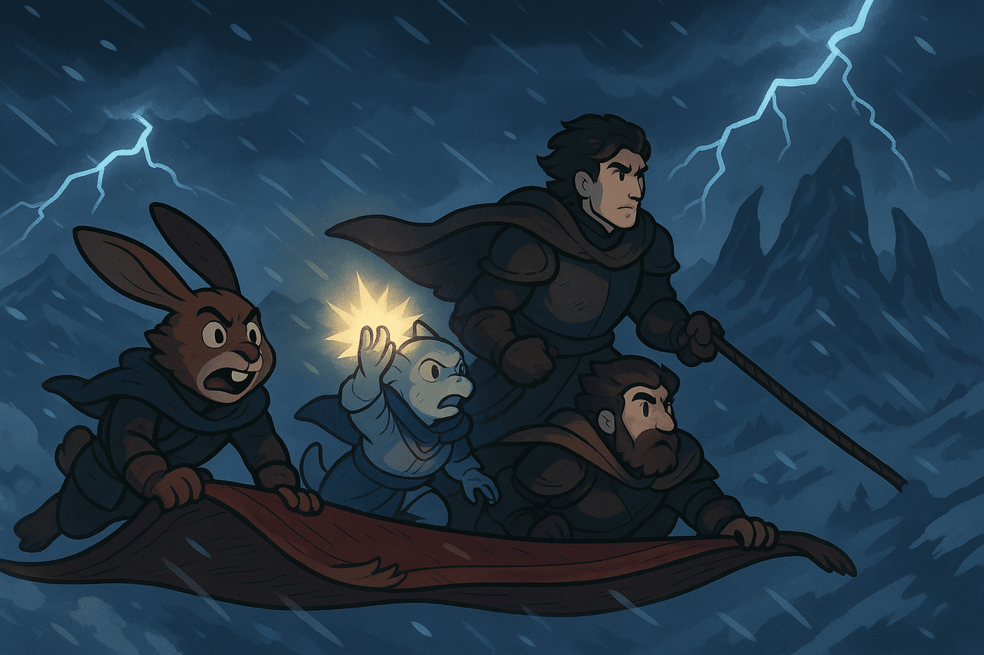 Cartoon-style fantasy travel scene, wide aspect ratio. The party rides the flying carpet over a blizzard-swept mountain range. Below, lightning flashes illuminate distant claw-shaped peaks. The heroes lean into the wind — Boris gripping the carpet edge, Haru shielding his face with radiant light, Virgil holding a rope tether, and Sundr glowing faintly with divine energy. A feeling of dangerous purpose and cold determination.