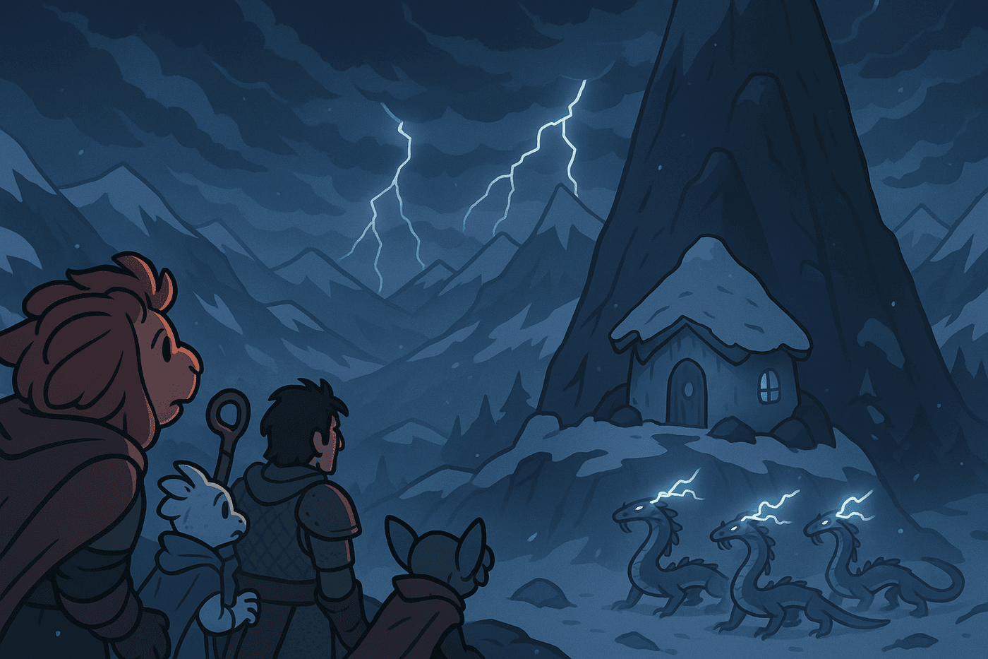 Cartoon-style fantasy scene, wide aspect ratio. From a cliff overlook, the party spies Mother’s pale-blue hut built into the side of a mountain spire, glowing faintly under storm clouds. Three wingless behir-dragons prowl the snow below, lightning crackling between their horns. The scene is cinematic and eerie — equal parts beauty and menace.