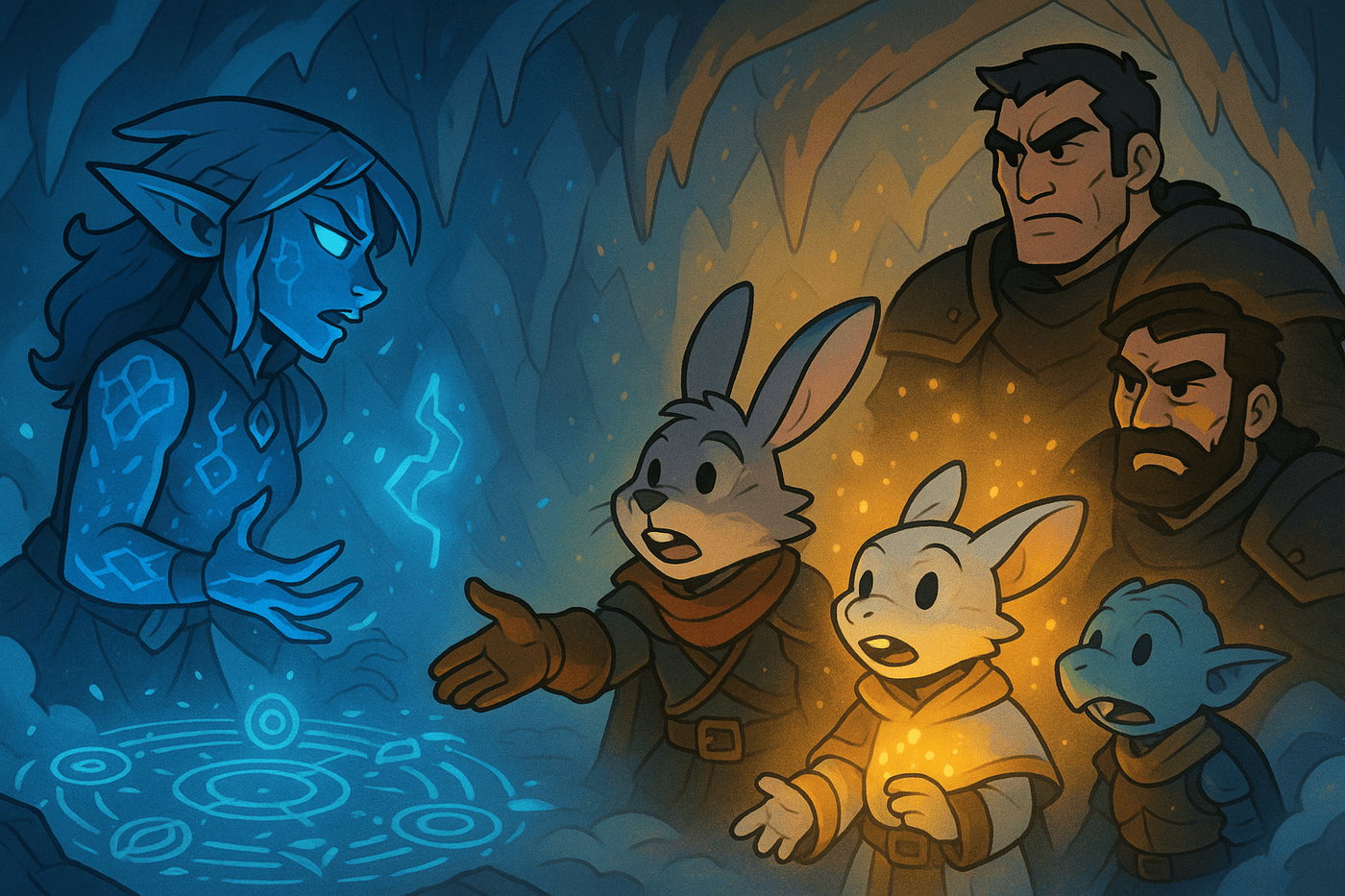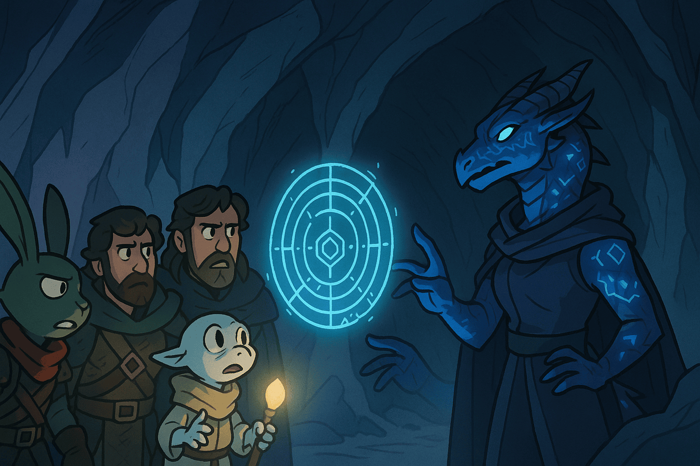 Cartoon-style fantasy negotiation scene, wide aspect ratio. Inside a dimly lit ice cave, the party faces Turkasa, a blue dragonborn with crackling runes etched into her scales. Her form flickers slightly, revealing she’s an illusion. She gestures toward a glowing arcane schematic of a ward circle in mid-air. The party’s faces reflect mixed suspicion and curiosity; Haru’s light and Sundr’s glow add divine counter-tones to her blue magic.