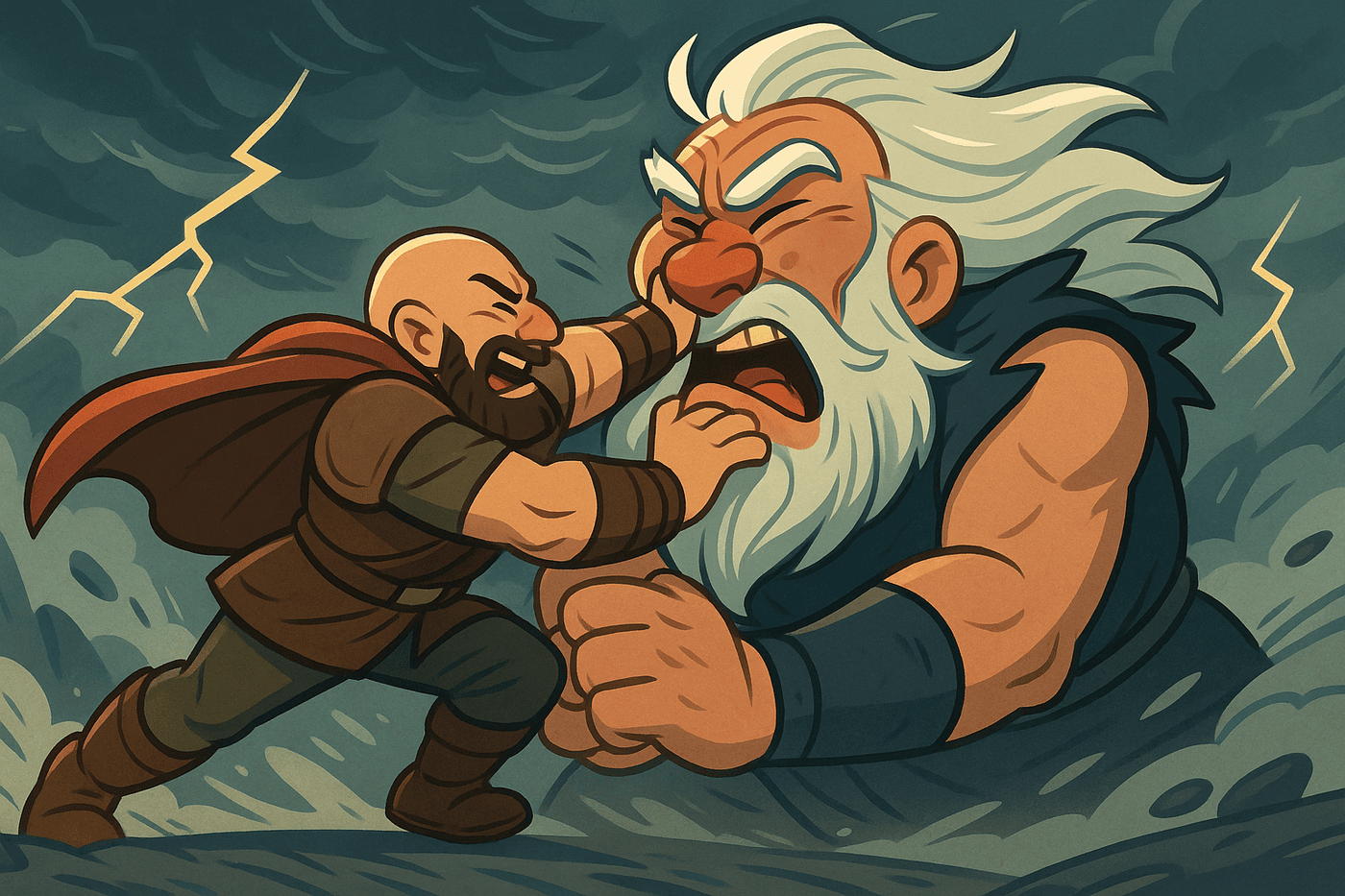 Cartoon-style fantasy action scene, wide aspect ratio. In the snowy temple courtyard, Virgil the goliath barbarian wrestles the towering cloud giant Rotan, grabbing his arm and driving a massive uppercut straight into the giant’s nose. The giant’s head jerks back in surprise, snow and pebbles flying. In the background, Boris, Kiet, Haru, and Sundr watch — half in awe, half in disbelief — as divine light and storm clouds swirl above them. The tone is heroic and slightly comedic, with exaggerated scale contrast and bold, dynamic motion lines.
