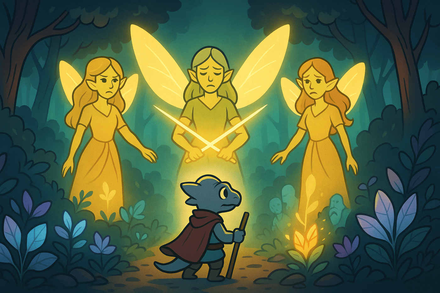Haru the small platinum kobold stands before three glowing fae sentinels in a forest path of crystal flowers. The fairies, radiant yet sorrowful, block his way with crossed wands. Mist glows behind them, suggesting Mother’s unseen power.