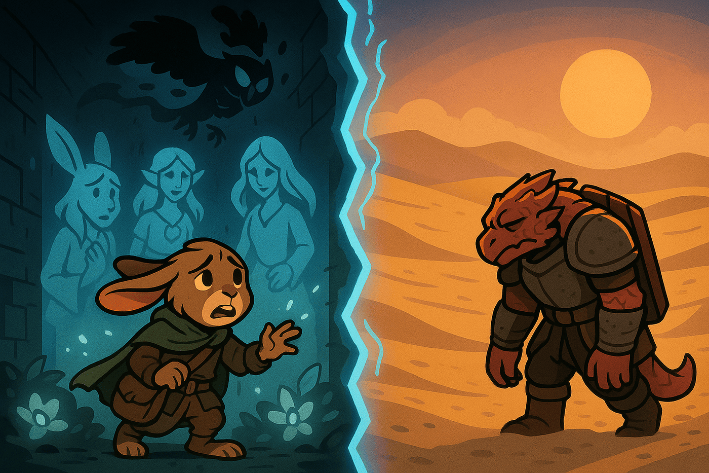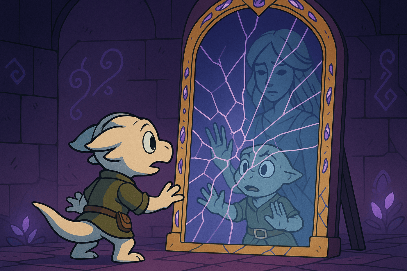 Haru faces his reflection in a tall mirror surrounded by arcane runes. His double mimics him perfectly until cracks spread through the glass. Beyond the shards lies a faint outline of a trapped elven woman — Varanestra — reaching out.