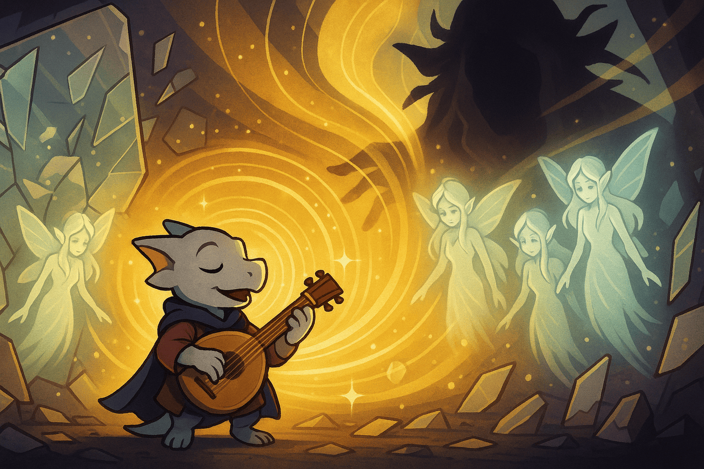 Haru strums a lute amid shattered mirrors and swirling light, his music creating ripples of divine energy. Behind him, ethereal fairies hover half-freed, their wings fading into light as Mother’s shadow looms through the portal.