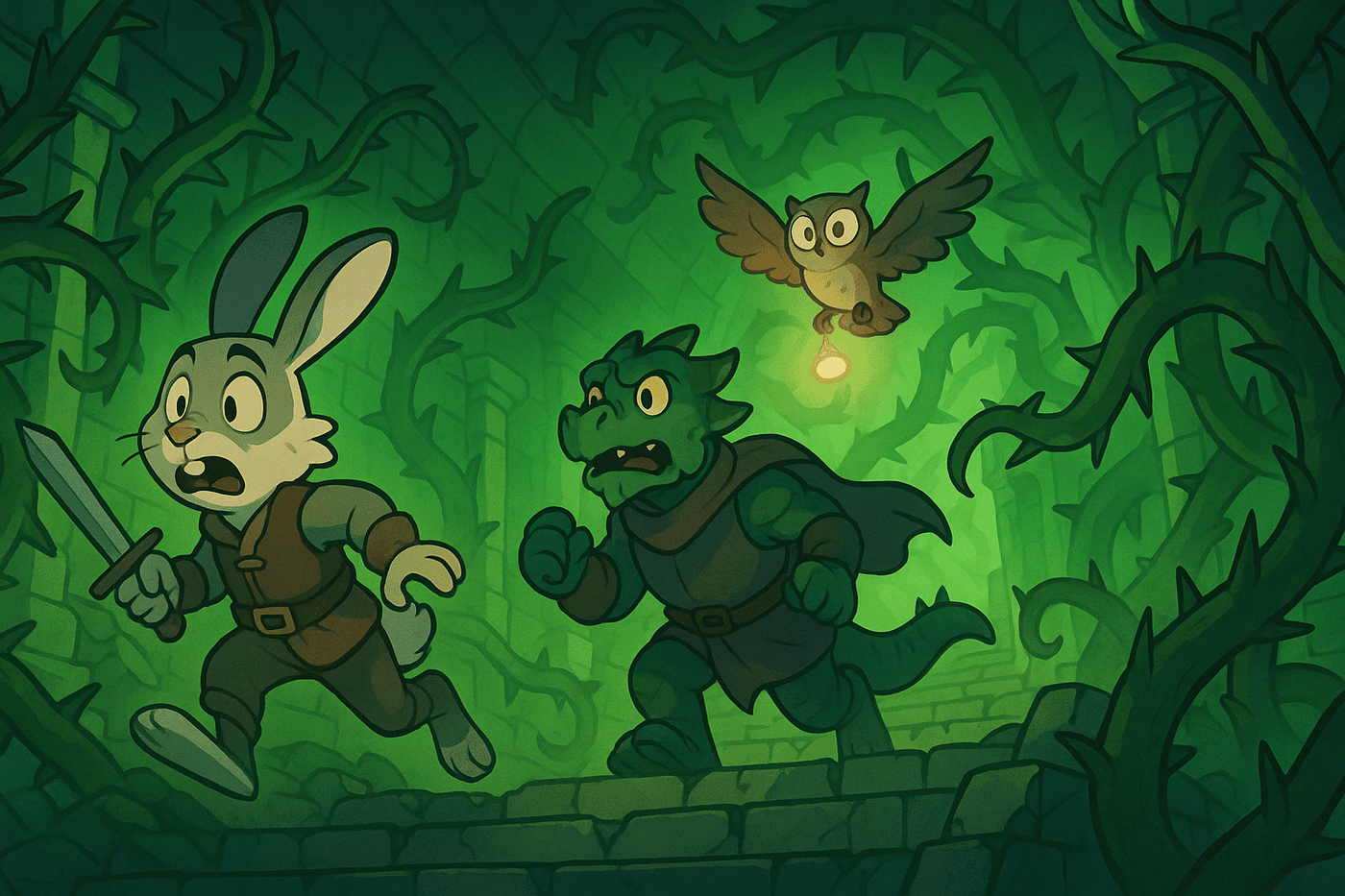 Boris the harengon and Kiet the dragonborn flee down a crumbling stone stairwell as thorned vines chase them like serpents. The temple walls pulse with green light, and Boris’s owl familiar flies ahead holding a faint lantern-glow.