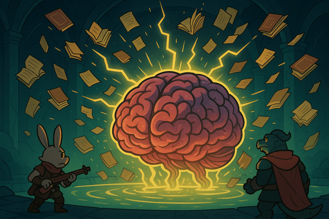 Inside a vast underground chamber, a colossal brain floats in a glass vat filled with glowing ichor. Boris and Kiet stand before it as it pulses with psychic energy. Books and scrolls swirl into the air around it like moths to flame.