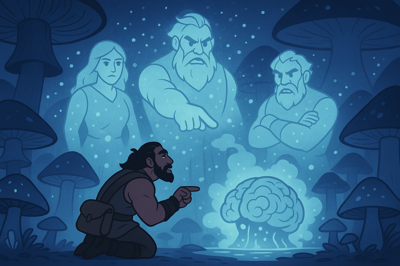Virgil, surrounded by towering bioluminescent mushrooms, kneels before ghostly Goliath ancestors emerging from spores. His father’s spirit points accusingly while spectral spores drift through the air like falling snow.