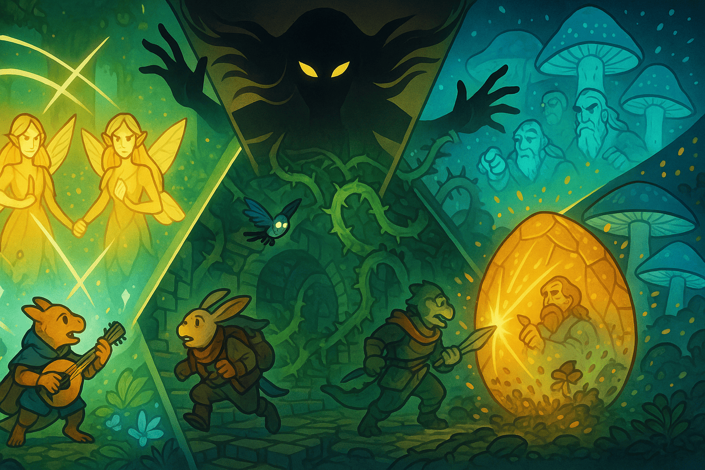 A single panoramic illustration showing three connected stories unfolding under the shadow of Mother. On the left, Haru the platinum kobold plays his lute before glowing fairies in a lush forest. In the center, Boris the harengon and Kiet the dragonborn flee through vine-choked temple ruins, their owl familiar flying ahead. On the right, Virgil strikes his spear against a massive amber cocoon surrounded by towering mushrooms. All three scenes flow together through shared glowing light and mist, while the looming silhouette of Mother watches from above, her eyes burning with golden power.