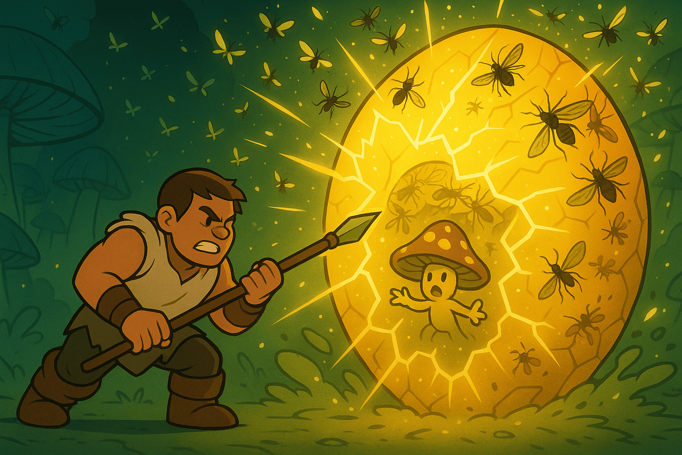 Virgil strikes a spear against a massive amber cocoon glowing gold. Inside, an insect swarm and a tiny mushroom figure strain to escape. Cracks spread outward, releasing tendrils of green-gold light and thousands of fluttering insects.