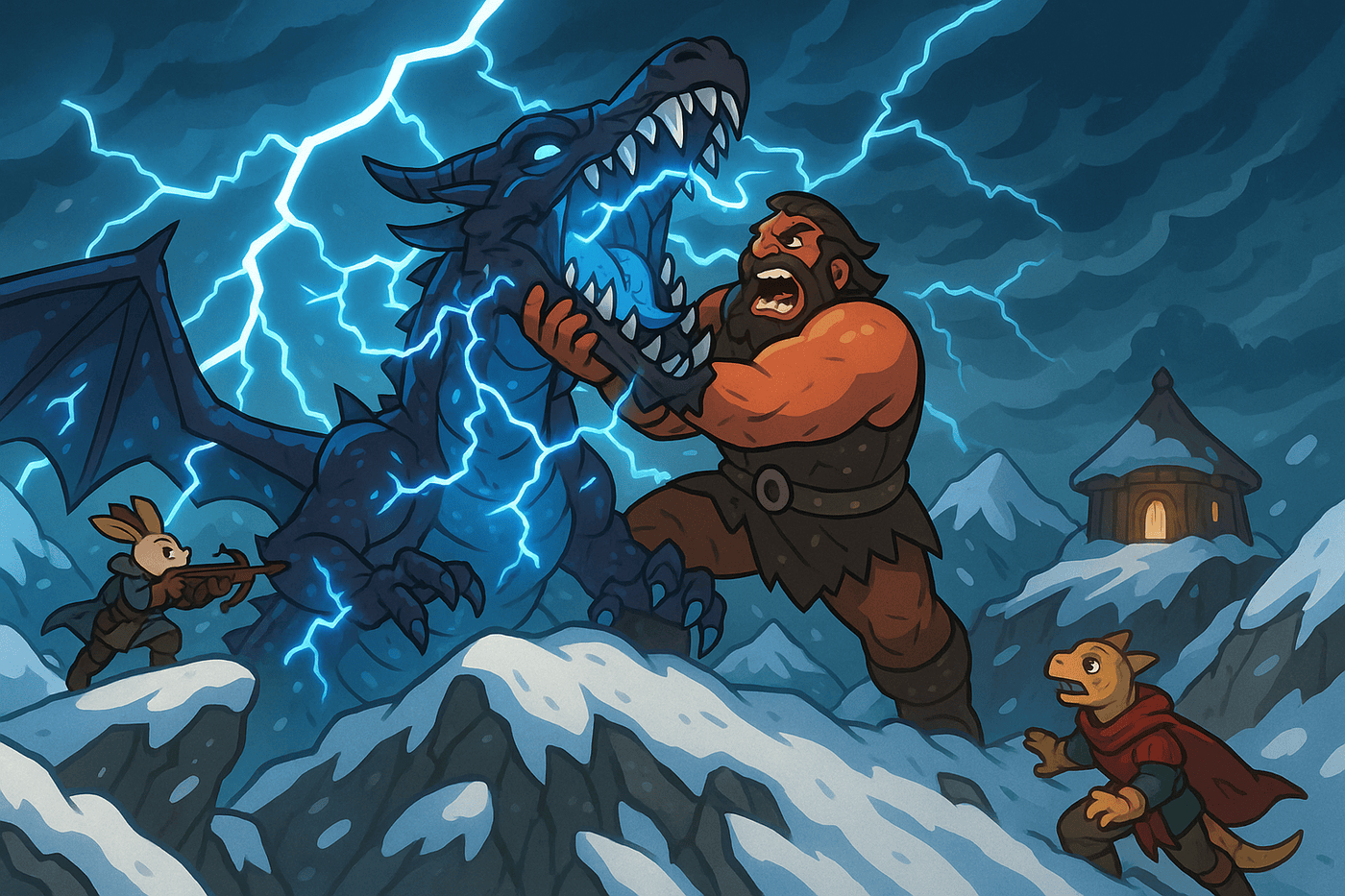 A corrupted lightning dragon thrashes atop a snowy mountain peak as Gemnar, enlarged into giant form, forces its shattered jaws open from the inside. Crackling blue lightning arcs around them. Boris fires crossbow bolts from a rocky ledge, Kyet scrambles back up the cliff after falling, and stormclouds curl above the ritual hut.