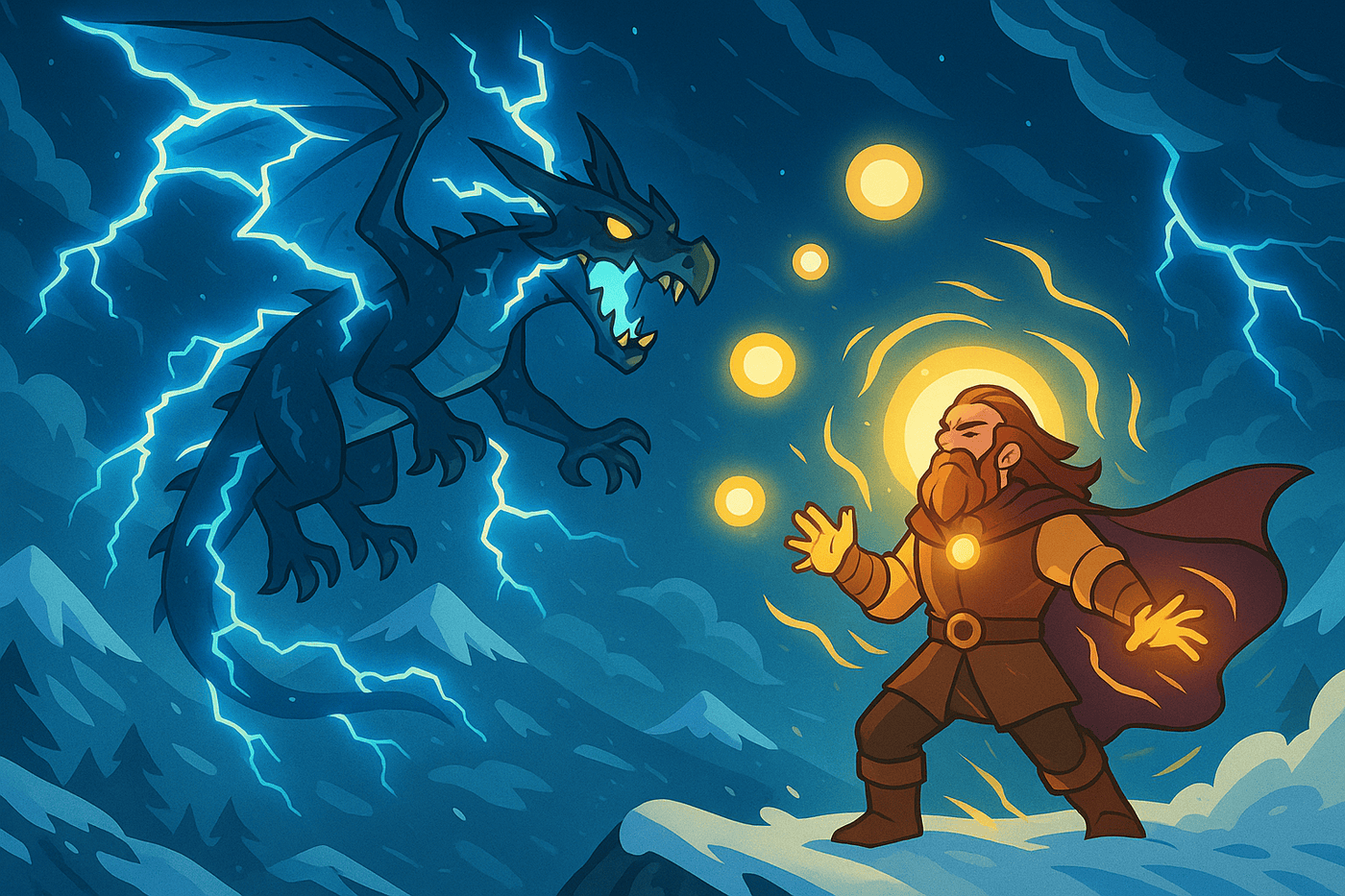 On a windy mountaintop, Sundr stands firm with radiant golden light flowing from him as he projects dancing, shifting orbs of luminescence to hypnotize a second lightning dragon. The massive beast hovers in midair, mesmerized. Snow and lightning swirl dramatically around them.
