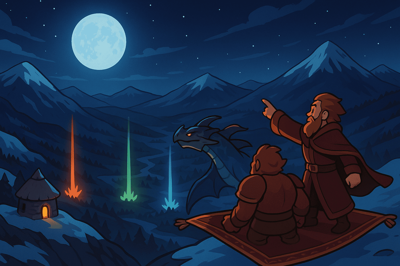 The magic carpet hovers near the ritual hut as Sundr and Gemnar look down at the valleys below, planning simultaneous strikes—three glowing ward-locations marked by beams of colored light. The rising moon casts silvery light across the mountains.