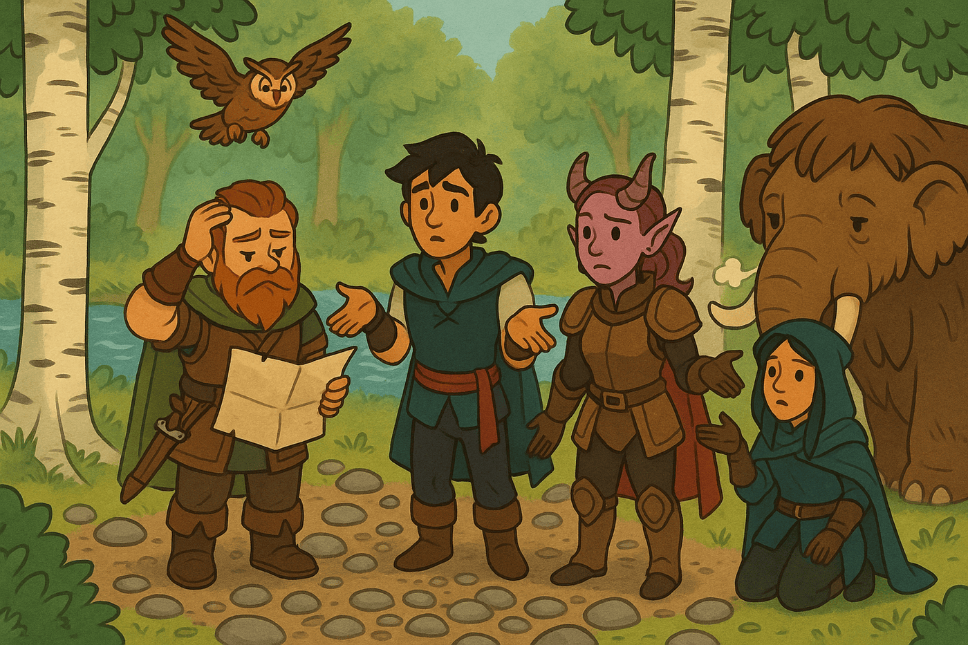 Boris, Kyet, Haru, and Turkasa materialize in the wrong forest clearing—no blue shimmering hut in sight. Everyone looks confused or annoyed. Haru’s mammoth snorts frost. Boris’s owl circles above searching for landmarks. The colors and trees look almost right… but not quite.