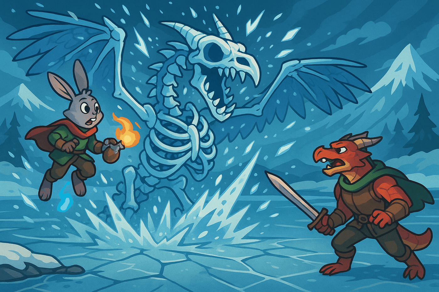 On a sheet of cracked ice, a colossal skeletal roc erupts upward, frost and bones exploding into the air. Boris hovers above with magical energy lifting him, holding a flask of oil and a glowing fireball bead. Kyet braces on the ice, readying a strike.