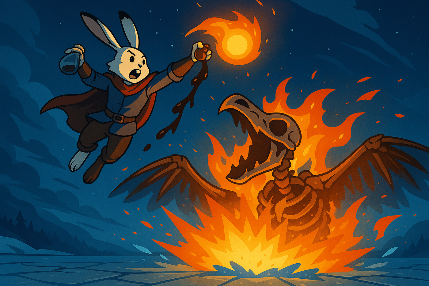 Boris drops a cascade of oil from the sky, then hurls a blazing fireball downward. The roc skeleton is engulfed in a brilliant inferno—orange and blue flame, the shockwave rippling through the frozen lake. Wide cinematic framing, dramatic lighting.