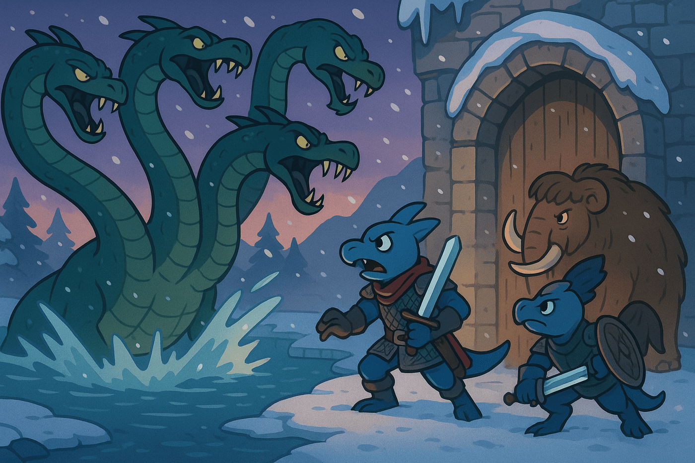 At a frost-rimmed doorway, blue kobold Haru stands in perfect defensive posture, mammoth behind him, AC impossibly high. Five serpentine heads burst from the icy water, snapping—but every strike misses as Haru’s blade flickers with expert parries.
