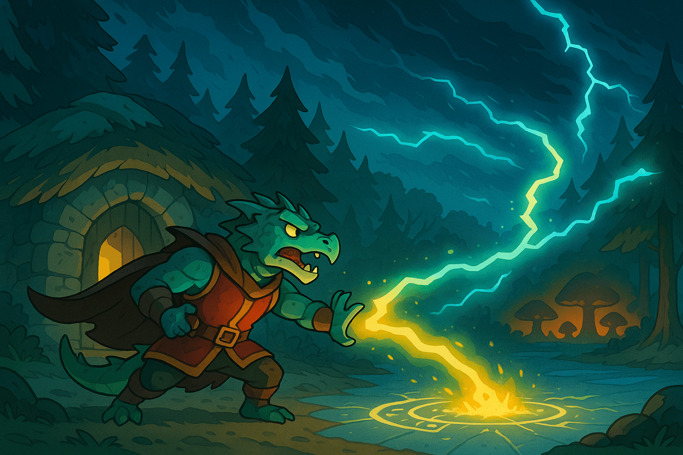 At the Lind Valley hut, Kiet channels radiant and storm energy through the warding circle. Runes ignite, the power bends off its usual Pazuzu conduit and instead arcs toward the mushroom battle at Blackroot. Trees tremble, distant mushroom silhouettes glow with surging strength.