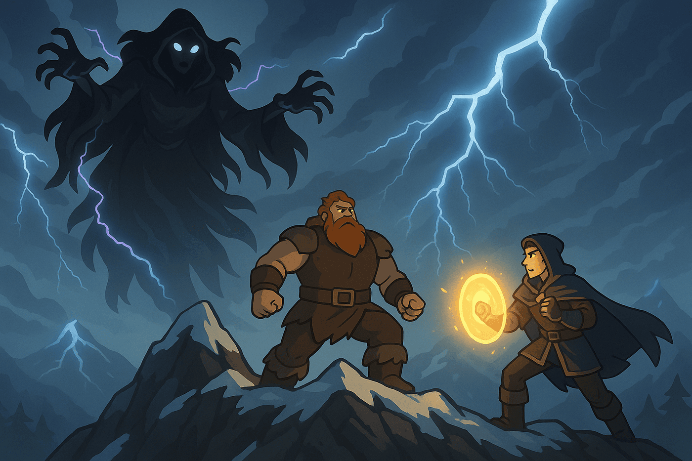 A towering shadowed figure—Mother—floats down over the mountain peak, spectral claws extended. Lightning splits the sky. Gemnar, still huge, stands defiantly; Sundr draws on Aegis energy, golden light pushing back against her suffocating darkness.