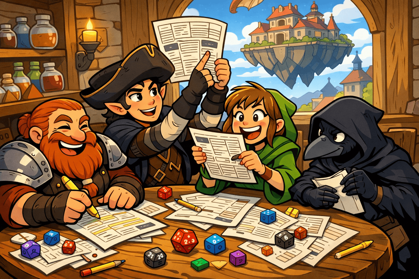 The party crowds around a cluttered tavern table, buried in character sheets, dice, and pencils, riding the chaotic high of leveling up. Thunck beams as he proudly marks down his expanded powers, while Kubo quietly points to an impressively high stat like it speaks for itself. Luna, naturally, is reading her sheet upside down with delighted confidence, and Raven—already one step ahead—is in the process of quietly acquiring a sheet that isn’t his. Through the tavern window, a floating duke’s mansion drifts above the city, a reminder that their next adventure is already looming.