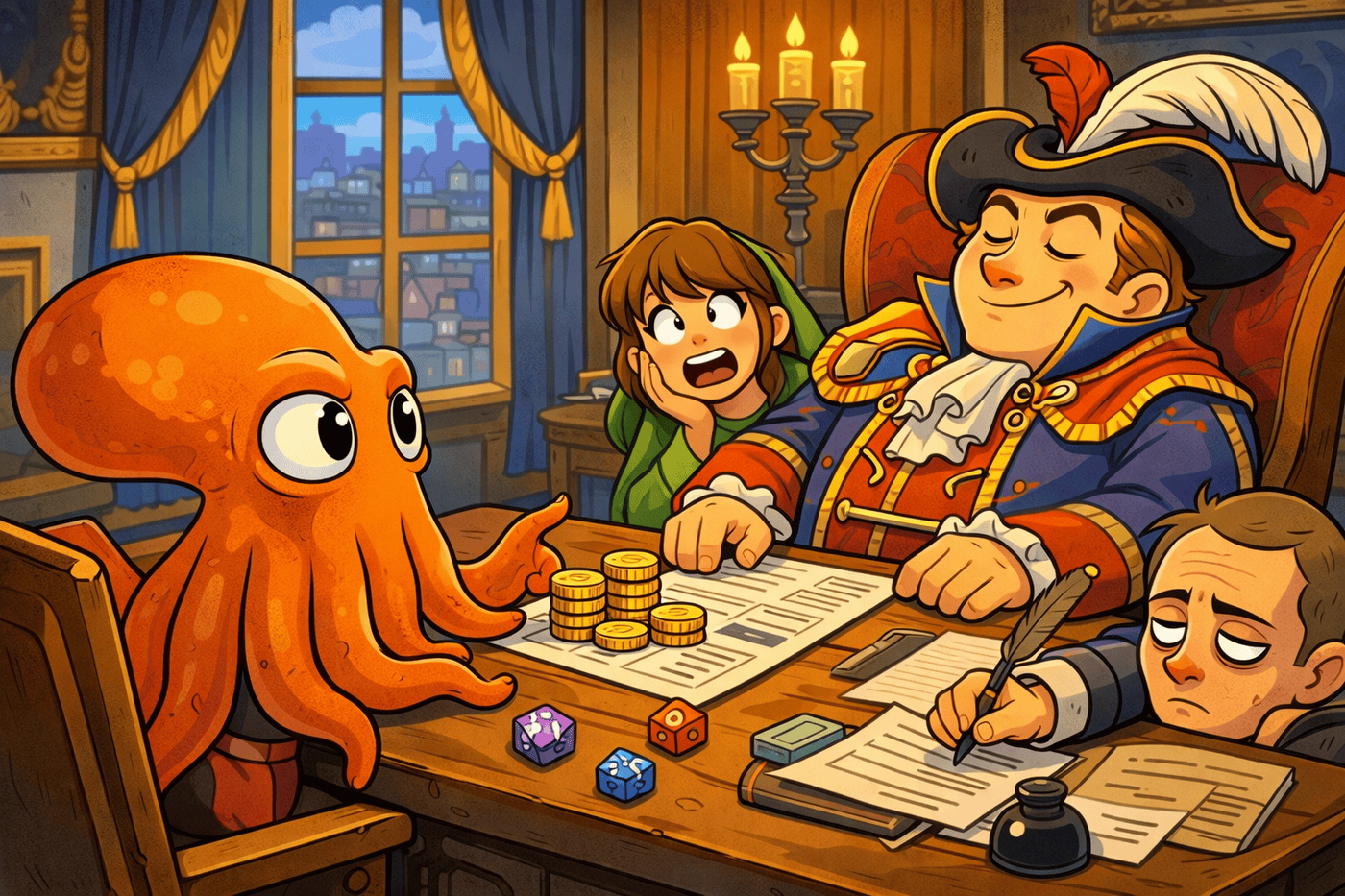 In a moment that somehow counts as “business,” Gerald sits upright across a massive desk, every tentacle carefully arranged as he negotiates with intense seriousness over a modest pile of coins. The duke, dressed in elaborate finery, leans back with theatrical arrogance, while Luna sits beside him translating Gerald’s gestures into increasingly strained whispers. Behind them, an assistant dutifully records the exchange with the hollow expression of someone who has seen too much. The whole scene plays like a high-stakes negotiation—if one party weren’t a deeply earnest landsquid.