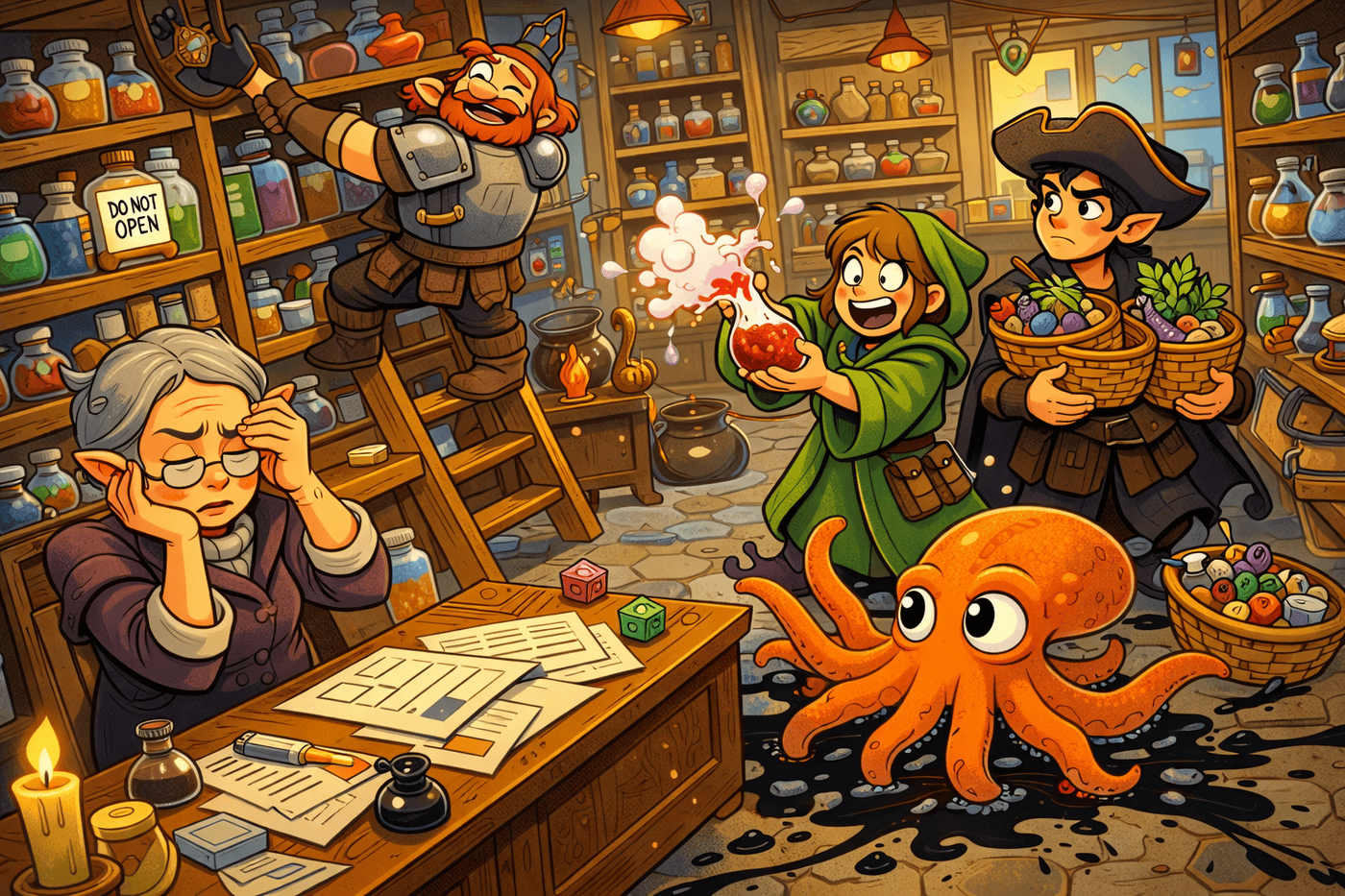 What began as a simple stop has devolved into total chaos inside a tightly packed potion shop. Thunck has climbed a rolling ladder he absolutely should not be on, reaching for something just out of grasp, while Luna enthusiastically shakes a potion that is seconds away from disaster. Kubo stands near the entrance, somehow holding multiple baskets of items he never meant to pick up, unsure how he got here. Meanwhile, Gerald leaves a trail of ink across the floor as the shopkeeper pinches the bridge of her nose, silently questioning every life decision that led to this moment. Behind her, a single jar labeled DO NOT OPEN sits ominously undisturbed—for now.