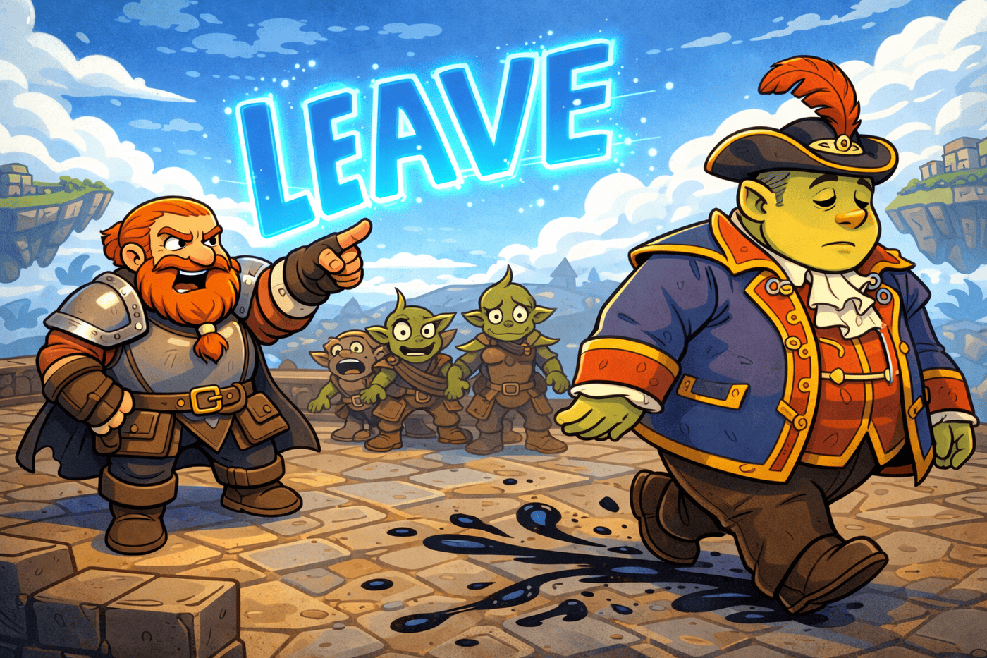 On a floating cobblestone street, Thunck plants his feet and delivers a single, undeniable command. With a sharp gesture, the word LEAVE blazes into existence in glowing blue magic, hanging heavy in the air. The large, well-dressed hobgoblin—mid-stride and mid-thought—turns and begins walking away without question, his expression blank and obedient. Behind him, his goblin crew stands frozen in stunned confusion, watching their leader calmly exit the situation as if this were always the plan.