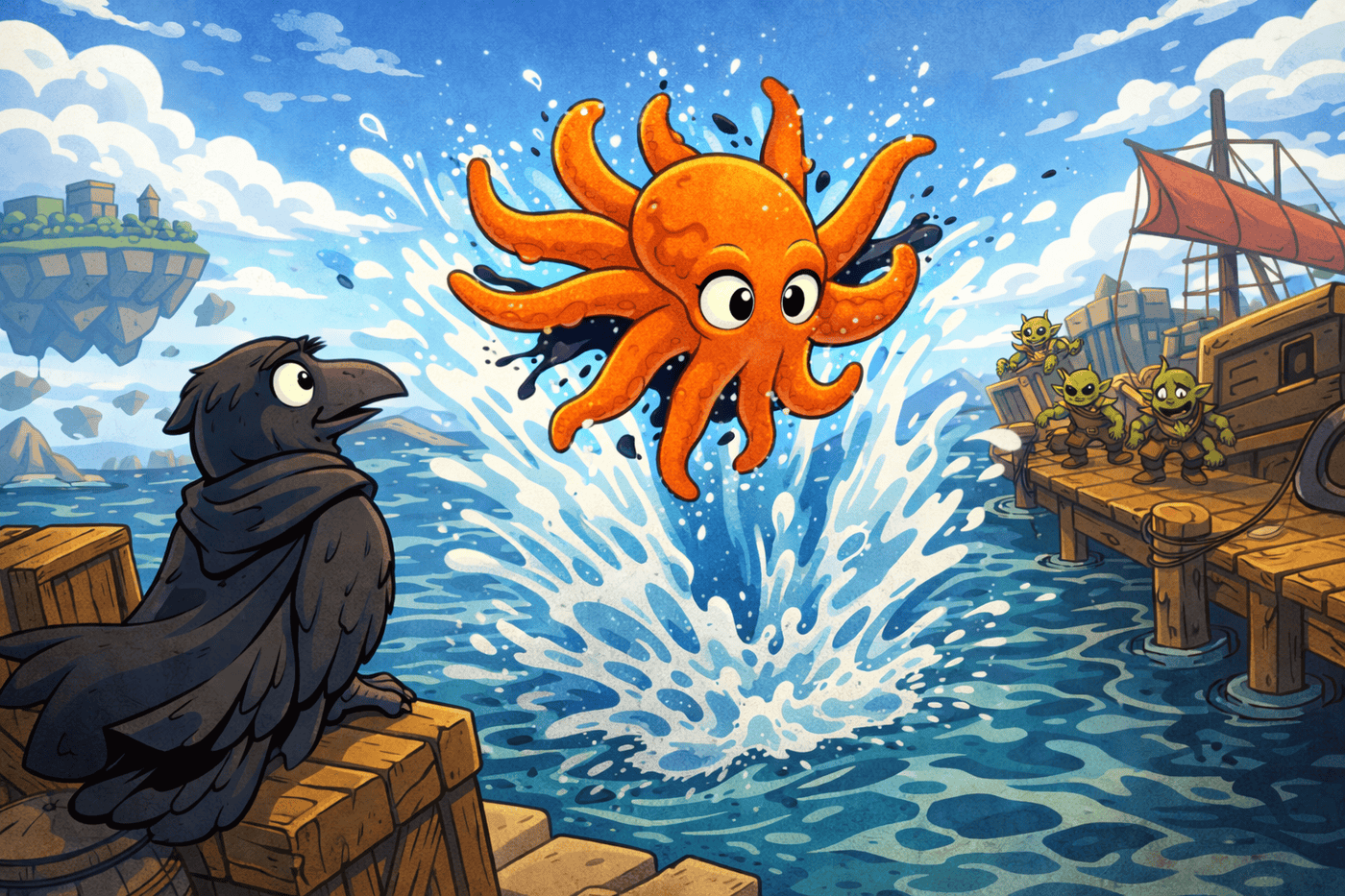 At the edge of a busy sky harbor, Gerald reaches a breaking point—and commits fully to it. Launching himself off the dock with surprising grace, he arcs through the air, tentacles spread wide before crashing into the water below in a massive, explosive splash. Raven watches from a nearby crate with mild, measured concern, while a group of goblin enforcers near a battered airship momentarily lose track of whatever they were doing. It is unclear if this was strategy, escape, or protest—but it was decisive.