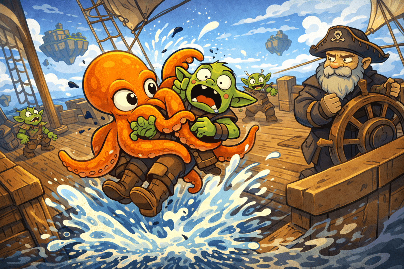On the deck of a small airborne vessel, combat breaks out in the most confusing way possible. Gerald becomes a blur of motion, tentacles wrapping decisively around a single goblin who has no idea what’s happening to him. The remaining goblins freeze, caught between panic and disbelief, unsure whether to intervene. At the helm, the ship’s grizzled captain watches with weary resignation, gripping the wheel like a man who has long since stopped asking questions.