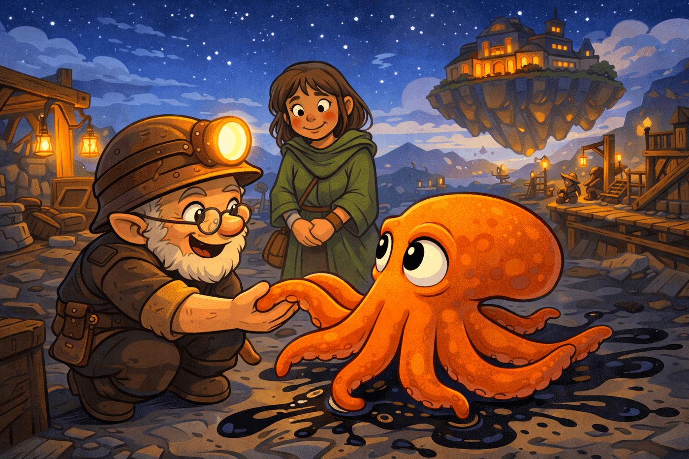 In the quiet glow of a lantern-lit mining camp, a small gnome named Pib crouches down with immediate and unmistakable delight, meeting Gerald eye to eye. Gerald, as always, responds with composed seriousness, blinking slowly as if acknowledging an equal. Nearby, Luna watches with a soft, approving smile. Behind them, the massive form of Driftstone Peak looms against the night sky, its faint glow contrasting with the warm, gentle lights of the camp.