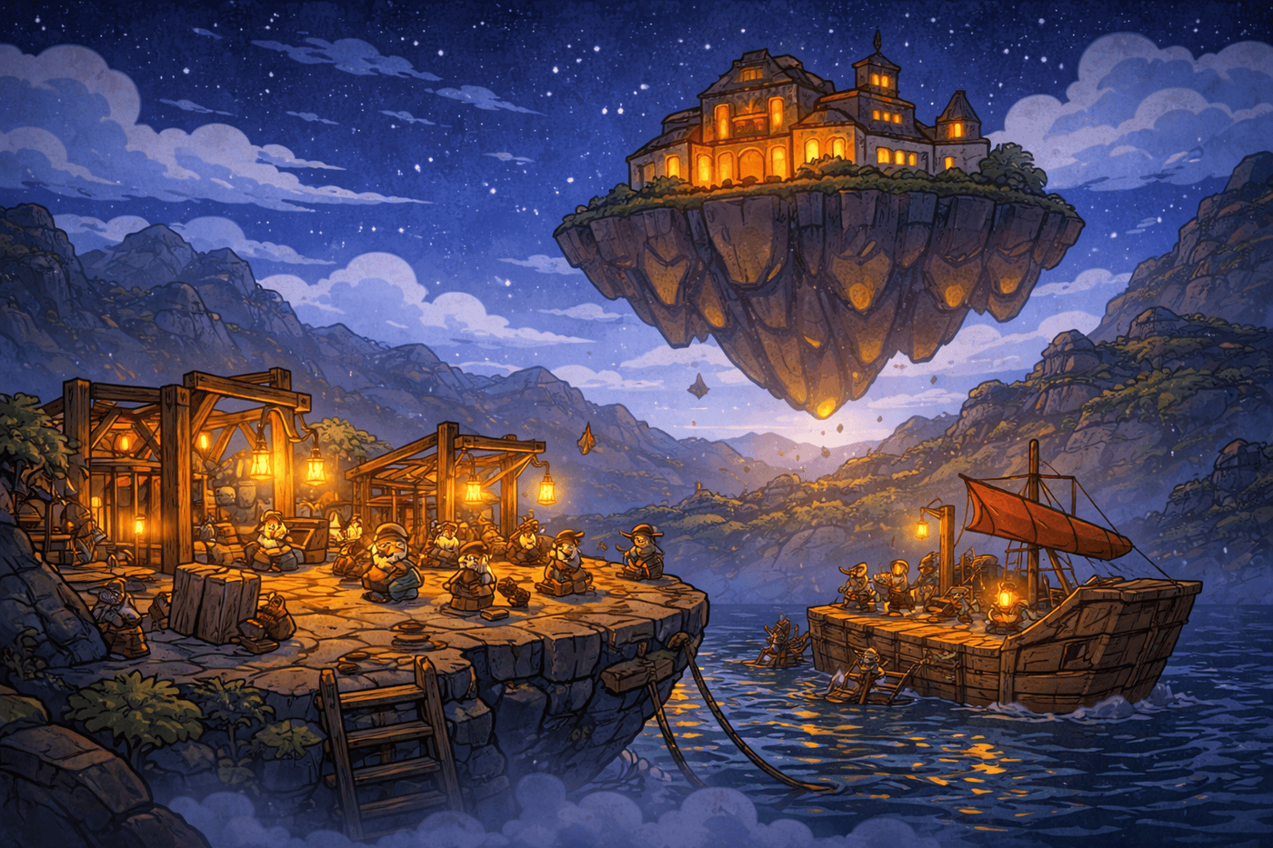 Driftstone Peak dominates the sky—an immense, jagged floating island carved with ancient ruins that pulse faintly with orange light. Beneath it, wooden scaffolding and mining platforms cling precariously to the rock, forming a fragile network of industry and ambition. In the foreground, a smaller floating island hosts a bustling gnome mining camp, its lanterns glowing like a constellation in the dark. A lone airship docks nearby, dwarfed by the scale of the world above it.