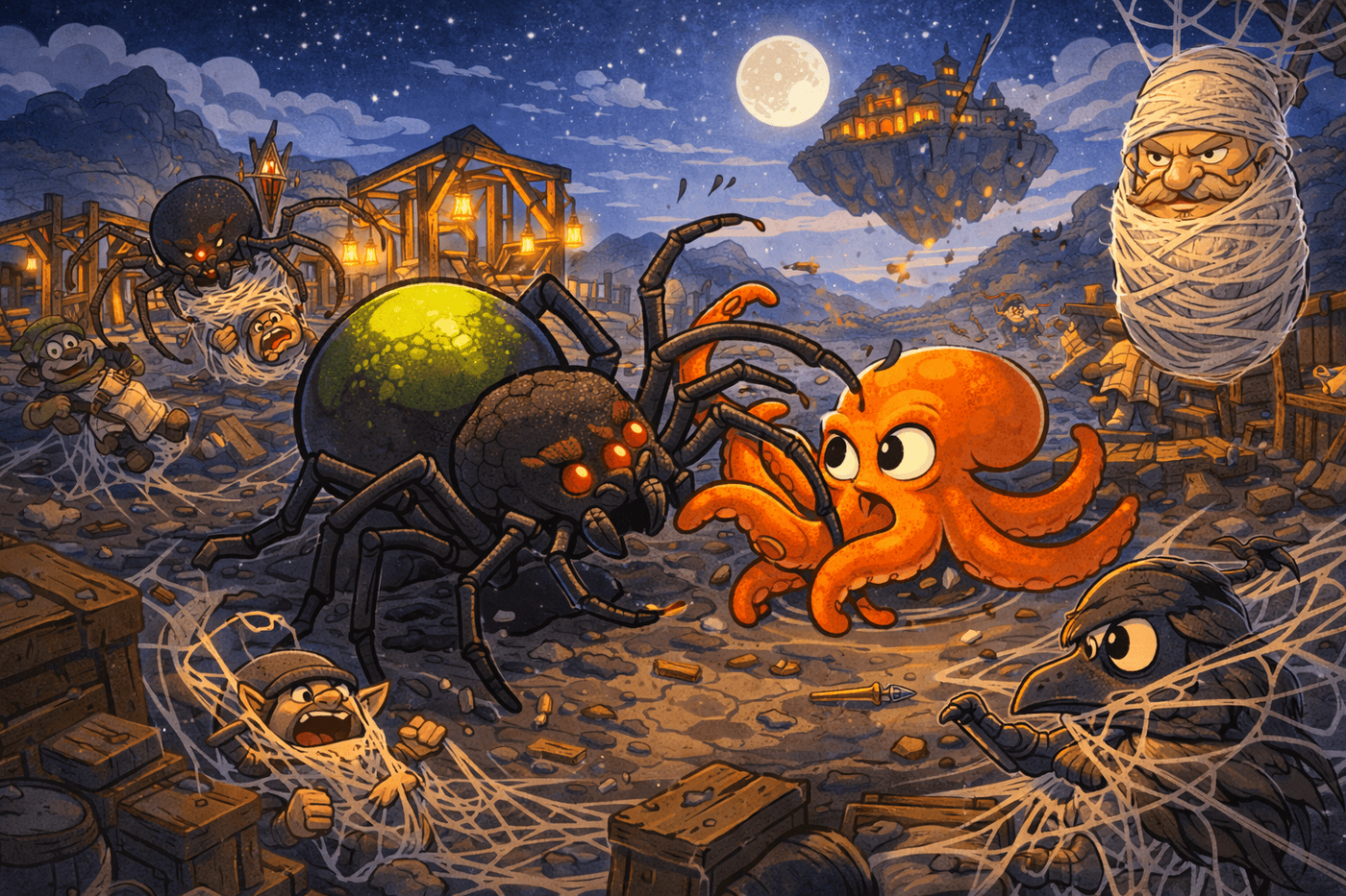 Chaos erupts under cold moonlight as giant spiders descend upon the mining camp. Gnomes are carried off in their grasp, while Thunck—fully cocooned in thick webbing—looks more offended than afraid. Raven, partially restrained but still determined, hurls a dart with practiced precision. At the center of it all, Gerald has somehow engaged a spider several times his size, locking onto it with unwavering commitment. Lantern light flickers across the scene, catching moments of panic, bravery, and utter absurdity.