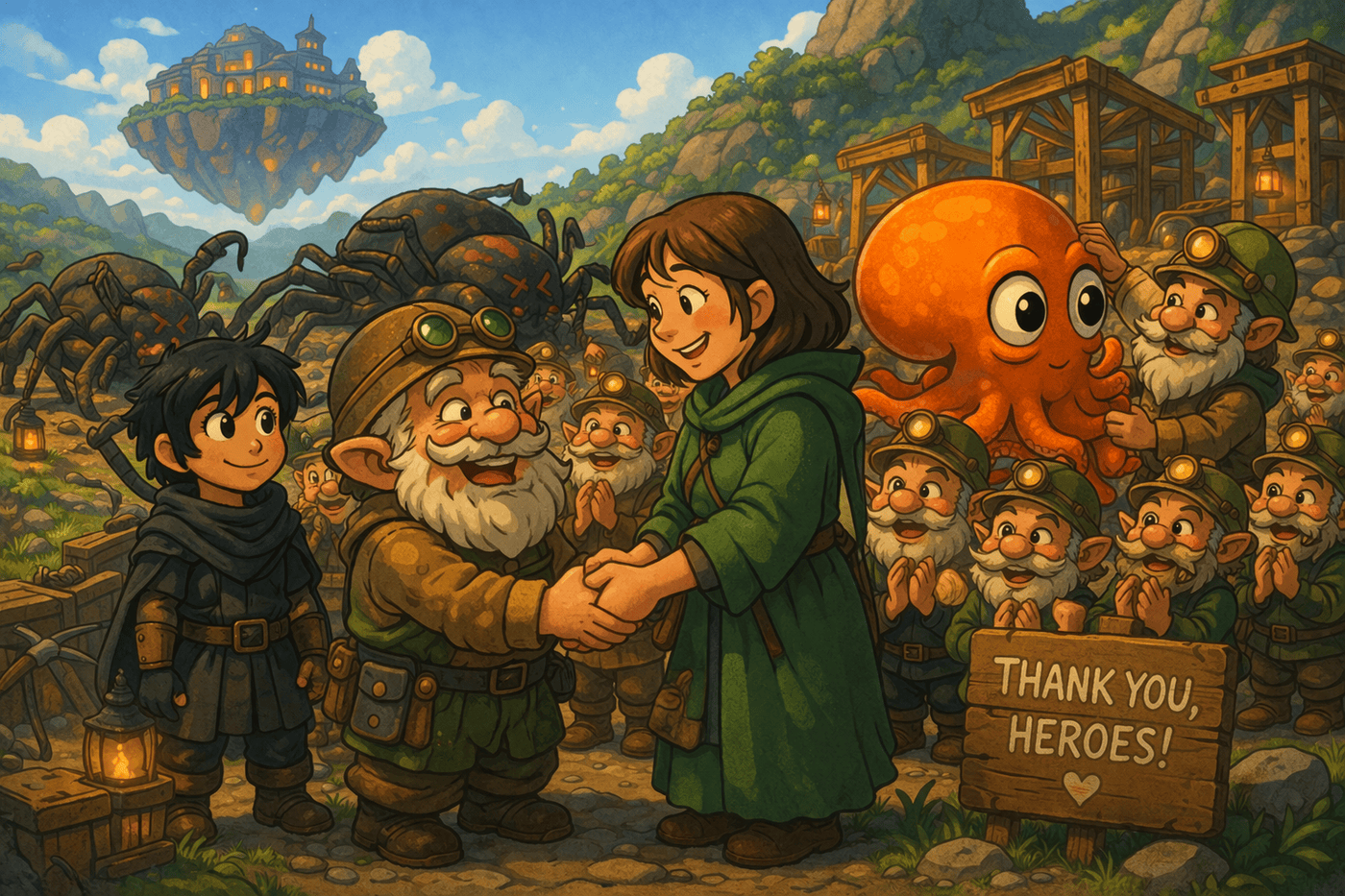 As morning light spills across the camp, relief replaces chaos. Pib moves from one adventurer to the next, gripping their hands with heartfelt gratitude, while a crowd of gnomes gathers behind him, smiling and visibly at ease. Gerald receives gentle pats on the head from an awestruck gnome, accepting the attention with polite tolerance. In the background, the fallen forms of the defeated spiders lie among the mining tools—a quiet reminder of the night before and the unlikely heroes who saw it through.