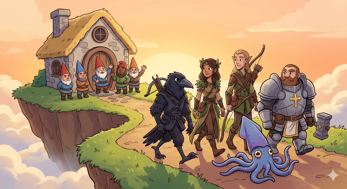 A wide cartoon scene at dawn on a floating island. A small group of gnomes stands at the doorway of a tiny stone cottage waving goodbye. In the foreground, five adventurers walk away: Raven (kenku rogue, black feathers, beak, crossbow), Luna (druid in leafy robes), Kubo (archer with longbow), Thunk (tiny dwarf cleric in enormous plate armor with holy symbol), and Gerald (a large friendly squid squirming along the ground beside them). One gnome looks slightly offended. Soft orange sunrise light. Clouds visible below the island’s edge. Whimsical, warm cartoon style.