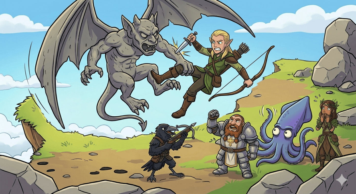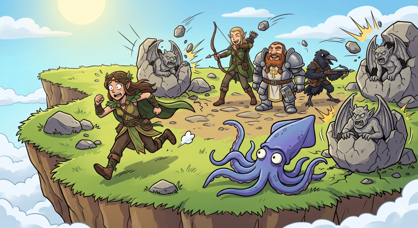 Wide cartoon illustration. A rocky field on a floating island. Five adventurers are walking casually when a large stone gargoyle — grey, winged, and furious — cracks open its eyes and unfurls its wings from among the boulders. The adventurers freeze mid-step with wide, panicked eyes. Raven (kenku rogue, black feathers, beak, crossbow) looks startled, Luna (druid, leafy robes) is already turning to run, Kubo (elf ranger, pointed ears, longbow) reaches for his bow, Thunk (tiny dwarf cleric, giant plate armor, holy symbol) squares up with a battle face, and Gerald (big blue squid) rears up on his back tentacles with all front tentacles raised. Bright daylight, cartoon style, dramatic action lines radiating from the gargoyle.