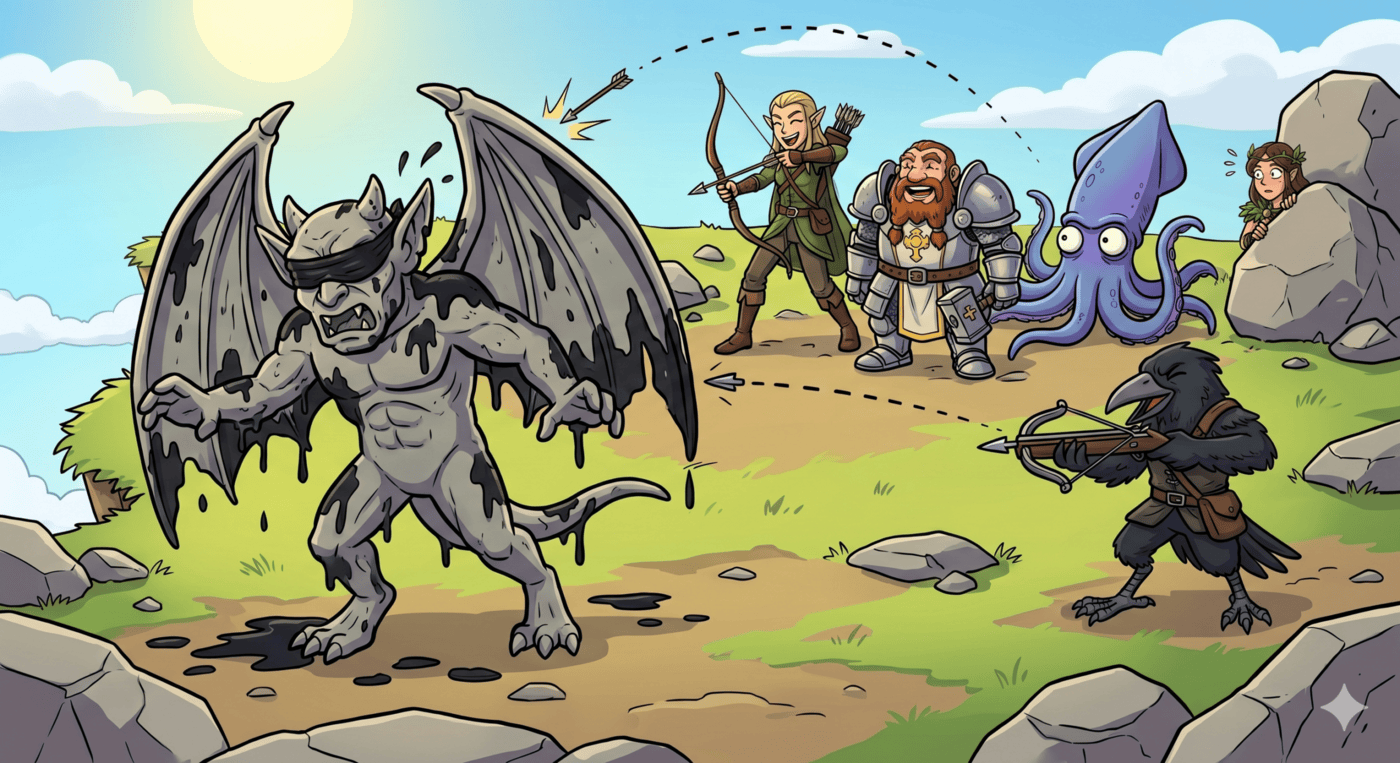Wide cartoon scene mid-battle. Gerald the large blue-purple squid companion rears back and blasts a massive jet of black ink directly into the face of a stone gargoyle. The gargoyle recoils, completely blinded, ink dripping down its rocky face and wings. Gerald looks extremely pleased with himself. In the background, Raven (kenku rogue, black feathers, beak, crossbow) and Kubo (elf ranger, pointed ears, longbow) cheer. Thunk (dwarf cleric, plate armor, holy symbol) gives a tiny thumbs up. Luna is visible far in the background, already retreating. Vibrant cartoon colors, comic book energy.