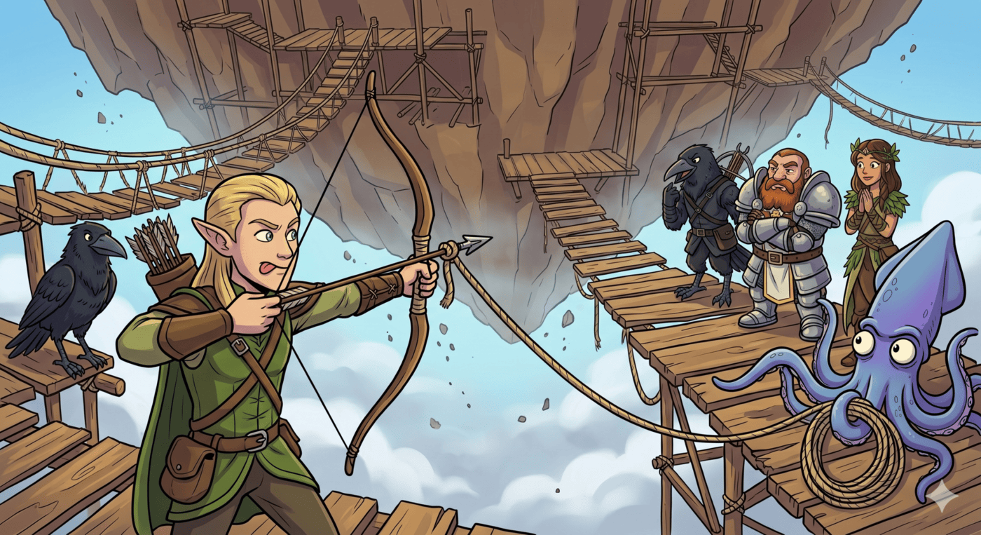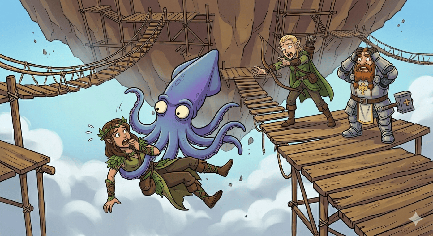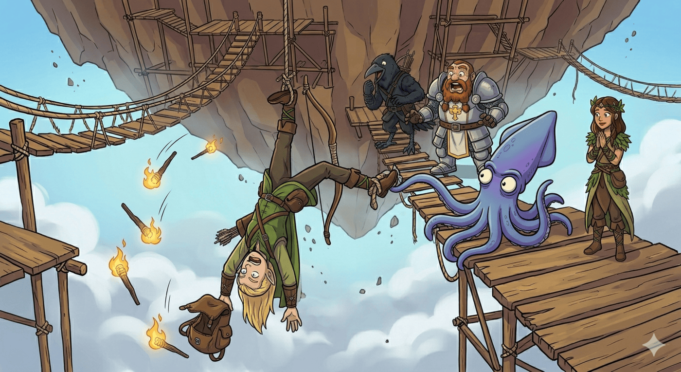 Wide cartoon illustration. On a creaking rope-and-plank scaffolding dangling beneath a floating island, Kubo (elf ranger, pointed ears, longbow) hangs completely upside down by one foot, arms dangling toward the infinite sky-void below. His backpack has fallen open and several torches are slowly tumbling away into the clouds below, getting smaller and smaller. His expression is somewhere between embarrassed and horrified. Raven (kenku rogue, black feathers, beak) and Thunk (dwarf cleric, plate armor) are on the platform above, staring down with open mouths. Gerald the squid reaches a tentacle toward Kubo helpfully but isn’t quite long enough. Luna watches from a safe spot three platforms back. Cartoon comedy gold, wide format.