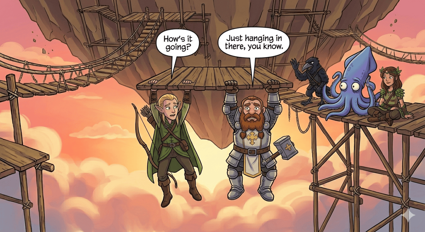 Wide cartoon illustration. On a single wooden scaffolding plank hanging beneath a floating island, Kubo (elf ranger, pointed ears) and Thunk (short stout dwarf cleric, heavy plate armor, holy symbol) hang off the edge side by side, each gripping the plank with both hands, feet dangling over the infinite cloudy abyss. Kubo looks at Thunk and says “How’s it going?” Thunk replies “Just hanging in there, you know.” Speech bubbles visible. They wear matching expressions of exhausted resignation. The sunset behind them is actually beautiful. In the background on solid platforms: Raven (kenku rogue, black feathers, beak, crossbow) waving awkwardly, Gerald (squid) with a tentacle pressed to his face squirming nearby, and Luna (druid) sitting calmly having already made it across. Wide, cartoon, bittersweet-funny.