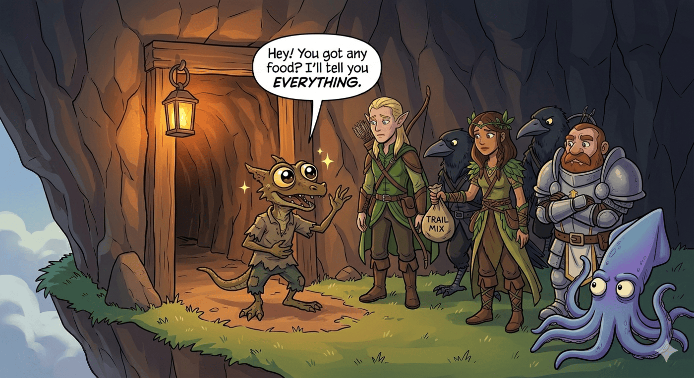 Wide cartoon illustration at the dark entrance to a mine carved into rocky cliffside on a floating island. A small, scraggly kobold named Grib — tiny lizard-like creature, big pleading eyes, tattered clothes, visibly thin from hunger — stands blocking the doorway with one hand raised in greeting and the other clutching his stomach. His expression is impossibly friendly and desperate at the same time. The exhausted adventuring party faces him: Kubo (elf ranger, pointed ears, longbow), Raven (kenku rogue, black feathers, beak), Luna (druid, leafy robes), Thunk (dwarf cleric, plate armor, holy symbol), and Gerald (large blue-purple squid squirming on the ground). Grib has a speech bubble: “Hey! You got any food? I’ll tell you EVERYTHING.” Someone in the party holds out a small bag of trail mix. Grib’s eyes are enormous with joy. Warm lantern light at the mine entrance, cartoon style.